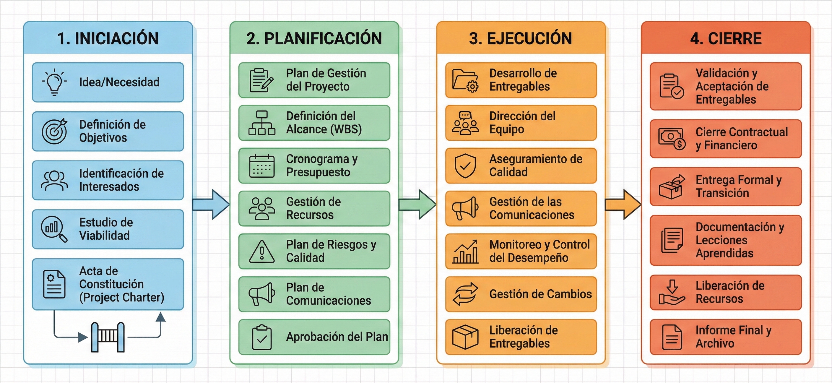 Fases típicas: inicio, planificación, ejecución y cierre.