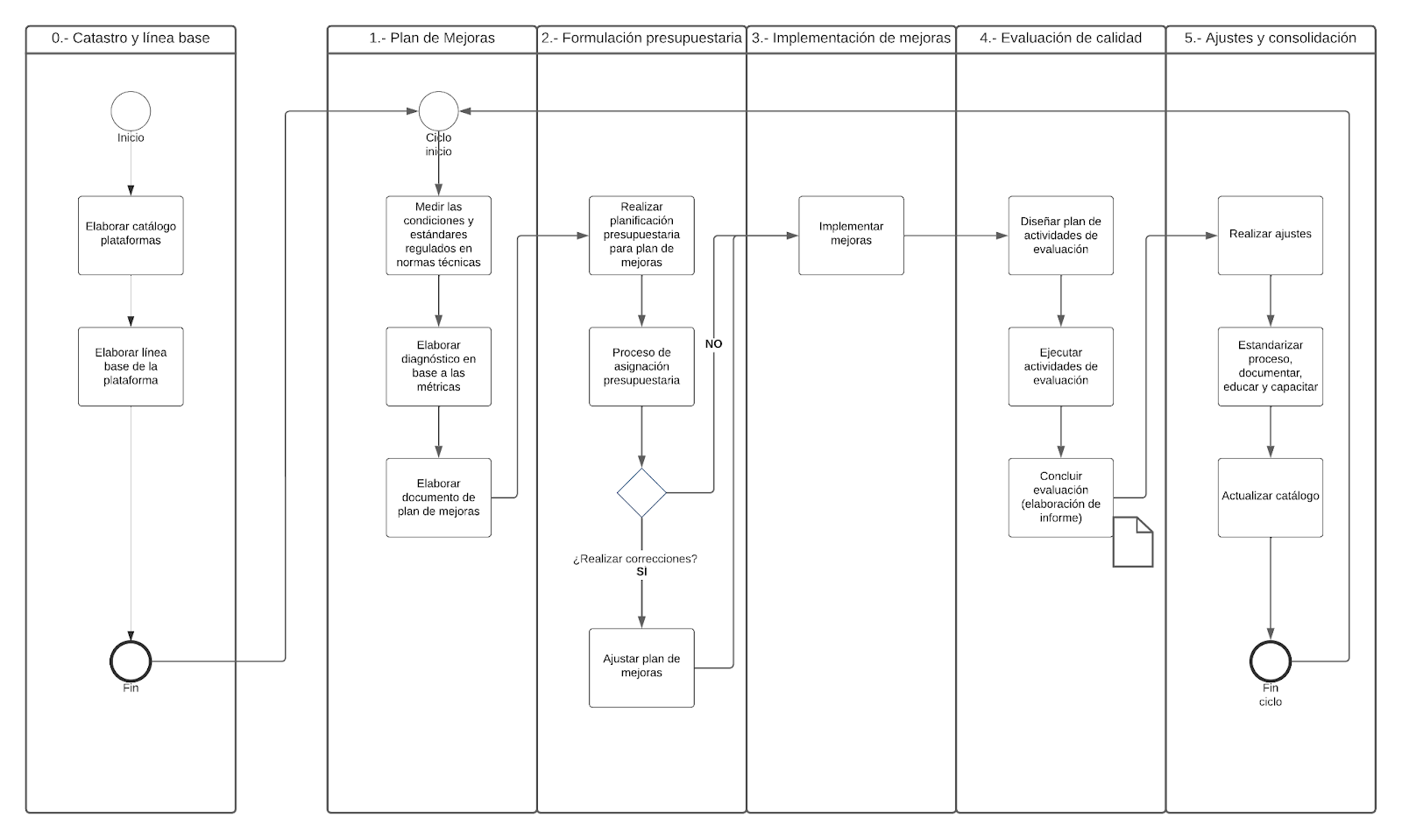 La Norma Técnica de Calidad y Funcionamiento, define Ciclo de Gestión de Calidad como el «Proceso de mejora continua de las plataformas electrónicas, cuyo objetivo será la reducción progresiva de las brechas tecnológicas detectadas respecto a los estándares requeridos para su funcionamiento. Este ciclo se materializa en el diseño, la implementación y la evaluación del Plan de Mejora Continua».